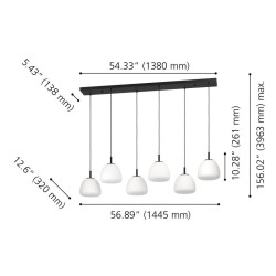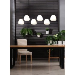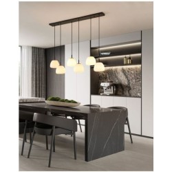 La suspension BALMES est composée de six abat-jours en verre opale blanc, chacun suspendu à un câble textile noir et à un long baldaquin en acier noir. Elle s'intègre parfaitement aux intérieurs modernes et offre un éclairage élégant dans le salon ou au-dessus de la table de la salle à manger.
